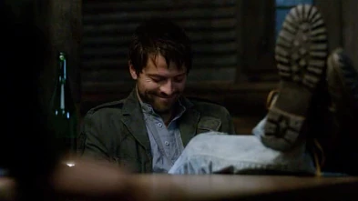 Future Dean has a mission to do and leaves Now Dean shackled. Eventually, Now Dean manages to claw a nail out of the wood flooring and free himself from his cuffs. He tries to sneak out into the compound but is approached by Chuck, who concernedly asks him for guidance about dwindling perishable and hygiene supplies for the community. A flustered Now Dean suggests, that they maybe, uh... share?? Chuck is confused by his answer, and then suddenly remembers and queries: "Aren't you supposed to be out on a mission right now?" Now Dean, still flustered, says, yes, he was just on his way to 'the mission.' Before he can turn to go, Risa approaches him from behind and takes a very purposeful swing at him, followed by a kick. Dean leaps behind Chuck, using him a shield from further abuse. Risa is angry that Future Dean spent time in another woman's cabin the night before. She angrily departs. Dean recovers and asks Chuck if Cass is still in the camp. Chuck laughingly says, yeah, he doesn't think Cass is going anywhere.