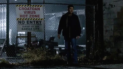 Night falls and he emerges from his hiding place. He sees the No Entry warning sign on the fence designating Kansas City as a Croatoan Virus Hot Zone. It is dated August 1st, 2014. He is confused. He hotwires an abandoned car and speeds off. As he tries to find a cell signal or even a radio station, Zachariah teleports into the car, much to Dean's dismay. "I thought I smelled your stink on this Back To the Future crap," Dean snarls.