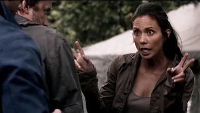 Future Dean returns to camp with his fellow hunters, and the men file out of the jeep. They all crack beers in celebration of returning from a successful mission. As Now Dean walks toward them, Future Dean raises his gun and shoots a member of his hunting party in the head. Now Dean screams out, horrified. Everyone else is just as horrified at the sight of another Dean. Future Dean assures all onlookers that while the situation is obviously messed up, he will inform them of anything they need to know when they need to know it. Furious, Future Dean shoves Now Dean back into his cabin, and they argue about which was more disturbing for the "twitchy survivors" in the community: seeing their leader kill one of them in cold blood, or watching him converse with his clone. Future Dean points out that he recognized the signs of infection in the man, and that in these times, killing the Croatoan infected ("Croats") is commonplace.