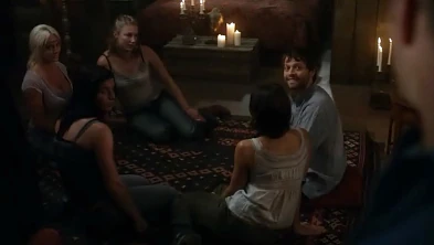 Dean finds Future Castiel in his cabin in half lotus, uttering nonsense at the head of a circle of entranced women. Castiel sees Dean slip in and, referring to Dean as their "fearless leader," tells the ladies that he needs to confer with him, and suggests to them that they all "go get washed up for the orgy." Cass stands and stretches as they exit.
