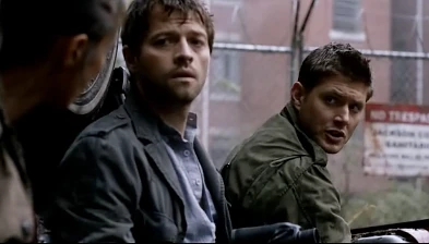 As the team departs, Chuck, who stays behind, tries to impart upon Now Dean how important it is to start hoarding toilet paper as soon as he gets back to 2009. Now Dean rides shotgun with Castiel. He is curious about why the historically uptight angel Castiel is now all about sex, drugs, etc. Castiel says he's no longer an angel, and he knows it had something to do with the other angels bailing on Earth. His angel mojo just drained away. He misses being an angel and is depressed about it, but figures a bit of decadence is in order, considering the state of things. The next morning the group arrives in a city torn down by the infection. They search and finally locate the building they need to break into. Future Dean, Risa, and Castiel prepare their weapons. Future Dean tells the team to go in through a 2nd story window. Risa voices concern about the game plan and she and Cass exchange glances. But, Future Dean tells them to trust him; "They'll never see us coming."